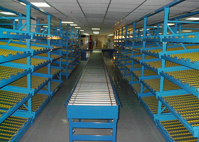 गुरुत्वाकर्षण वाले पैलेट प्रवाह रैक के संबंध में, पैलेट रोलर्स पर रखे जाते हैं जो गुरुत्वाकर्षण द्वारा संचालित पिक चेहरे की ओर ढलान करते हैं, पहले अंदर और पहले बाहर। पैलेट एक तरफ से खिलाए जाते हैं,और विपरीत पक्ष से प्राप्त प्राप्त करने के लिए प्राप्त क्षेत्र से दोहरी हैंडलिंग को समाप्तस्टॉक रोटेशन के साथ संयोजन में उत्पादन की गति इस प्रणाली का प्रमुख लाभ है।