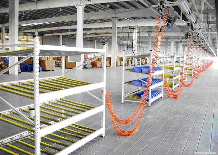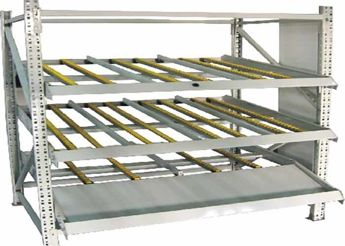 गुरुत्वाकर्षण वाले पैलेट प्रवाह रैक के संबंध में, पैलेट रोलर्स पर रखे जाते हैं जो गुरुत्वाकर्षण द्वारा संचालित पिक चेहरे की ओर ढलान करते हैं, पहले अंदर और पहले बाहर। पैलेट एक तरफ से खिलाए जाते हैं,और विपरीत पक्ष से प्राप्त प्राप्त करने के लिए प्राप्त क्षेत्र से दोहरी हैंडलिंग को समाप्तस्टॉक रोटेशन के साथ संयोजन में उत्पादन की गति इस प्रणाली का प्रमुख लाभ है।
